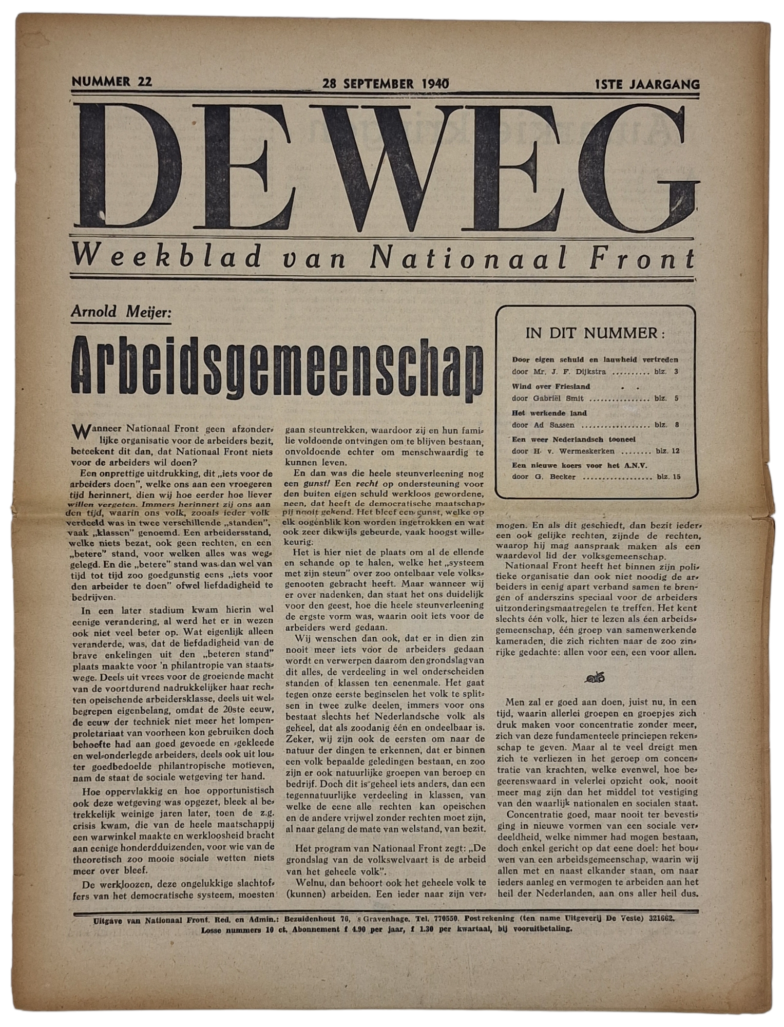 Original WW2 Dutch Collaboration Newspaper - Nationaal Front, Arnold Meijer, De Weg No. 22 (1940)
