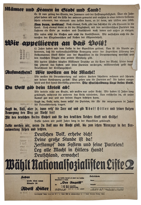 Original WW2 German NSDAP Document - Election Flyer Der Angriff Sonderdruck ''Aufruf an das Deutsche Volk!'' (1932)