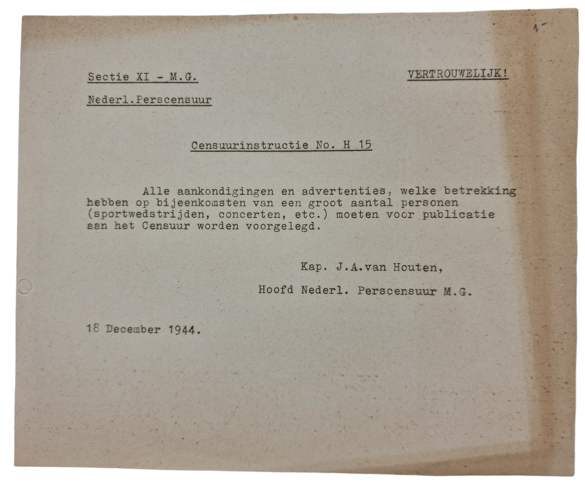 Origineel Wo2 Nederlands geallieerd Document - MG Militair Gezag H 15 Censuur, publiceren van grote evenementen (1944)