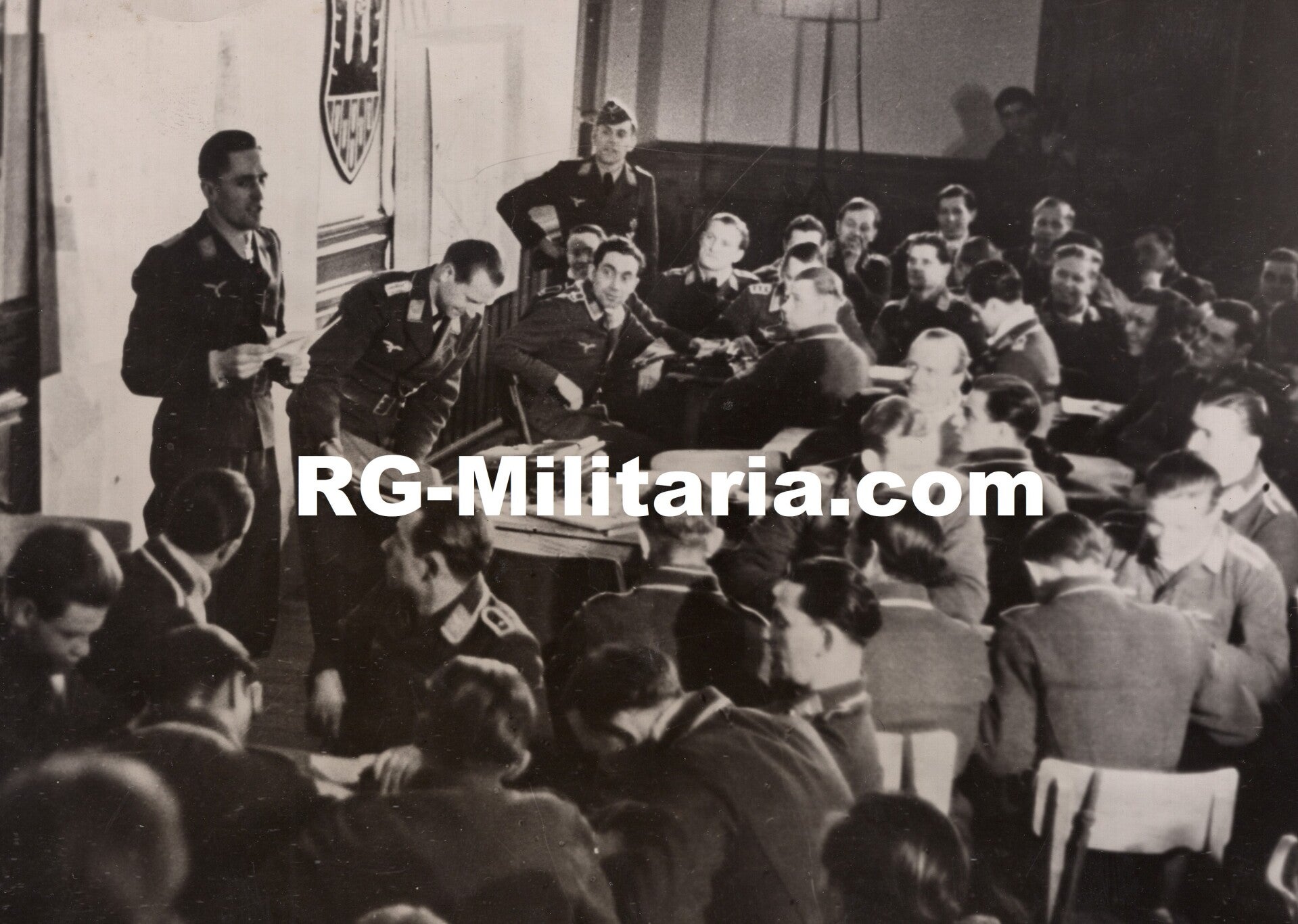 Originele WO2 Duitse Persfoto - Luftwaffe Ridderkruisdrager piloot vertelt een klas zijn ervaringen