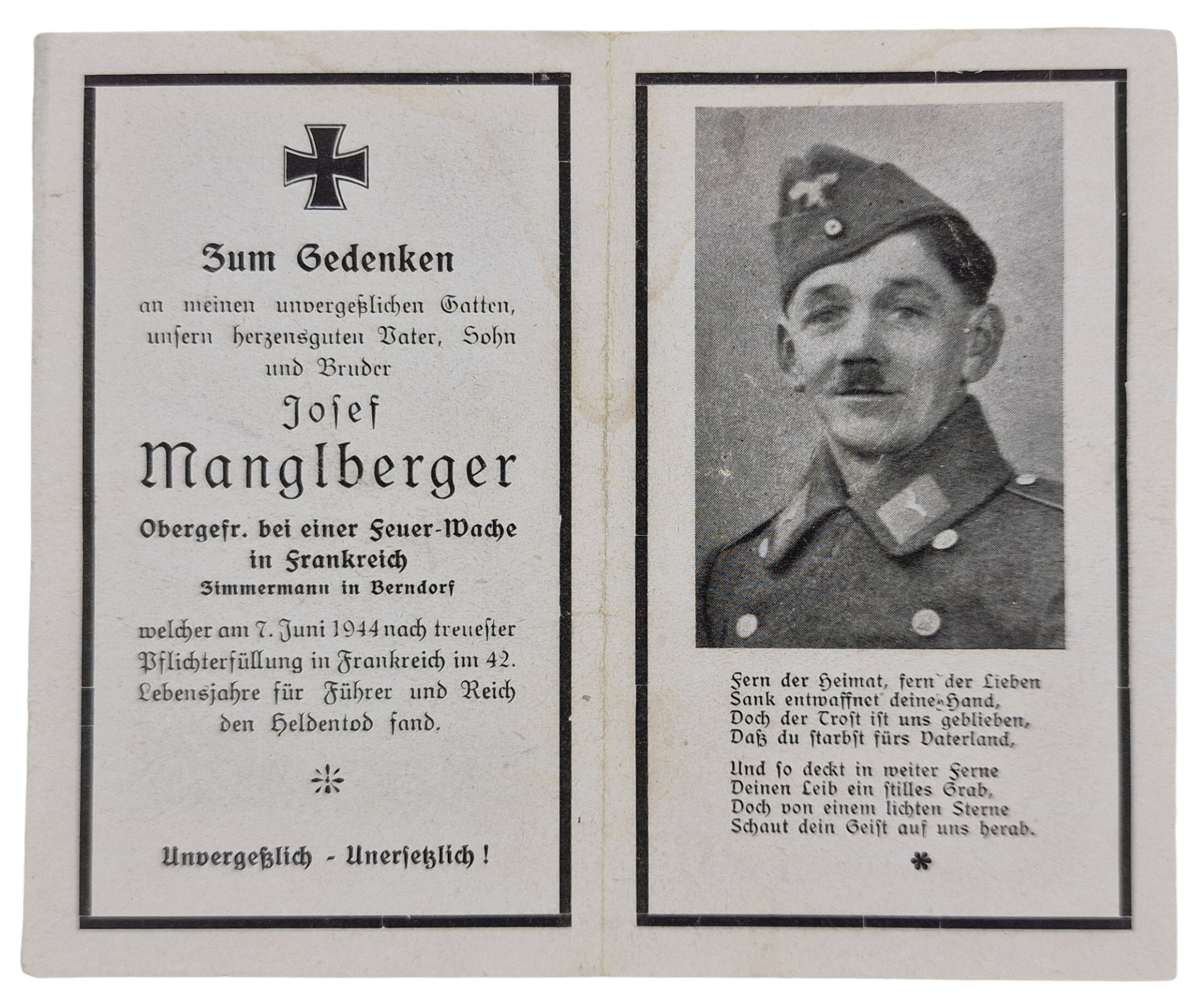 Original WW2 German Document - Death Card Josef Manglberger, Operation Overlord, Normandy, France (1944)