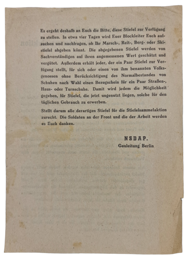 Original WW2 German Document - Merkblatt für die Haushaltungen zur Dutchführung der Stiefelsammelaktion, NSDAP Gauleitung Berlin