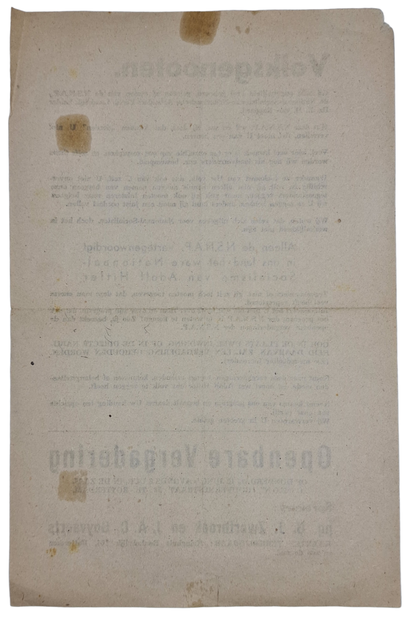 Origineel Wo2 Nederlandse Collaboratie NSNAP Flyer - Volksgenooten, bijeenkomst Zwertbroek & Goyvaerts, Rotterdam (1941)