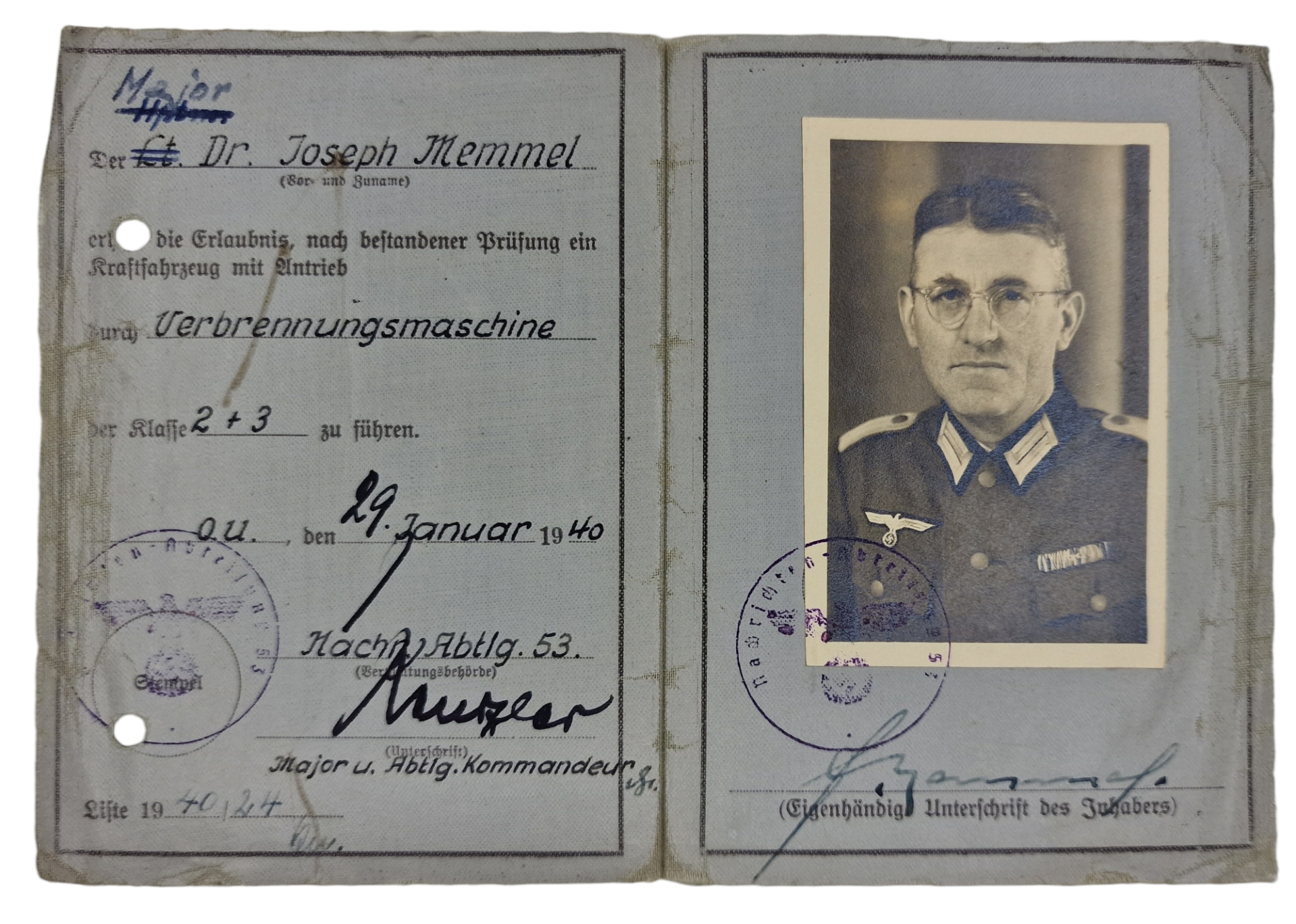 Original WW2 German Document - Wehrmacht Führerschein Major Joseph Memmel, Leichte Nachrichtenkolonne Nachr. Abtlg. 53 (1940)