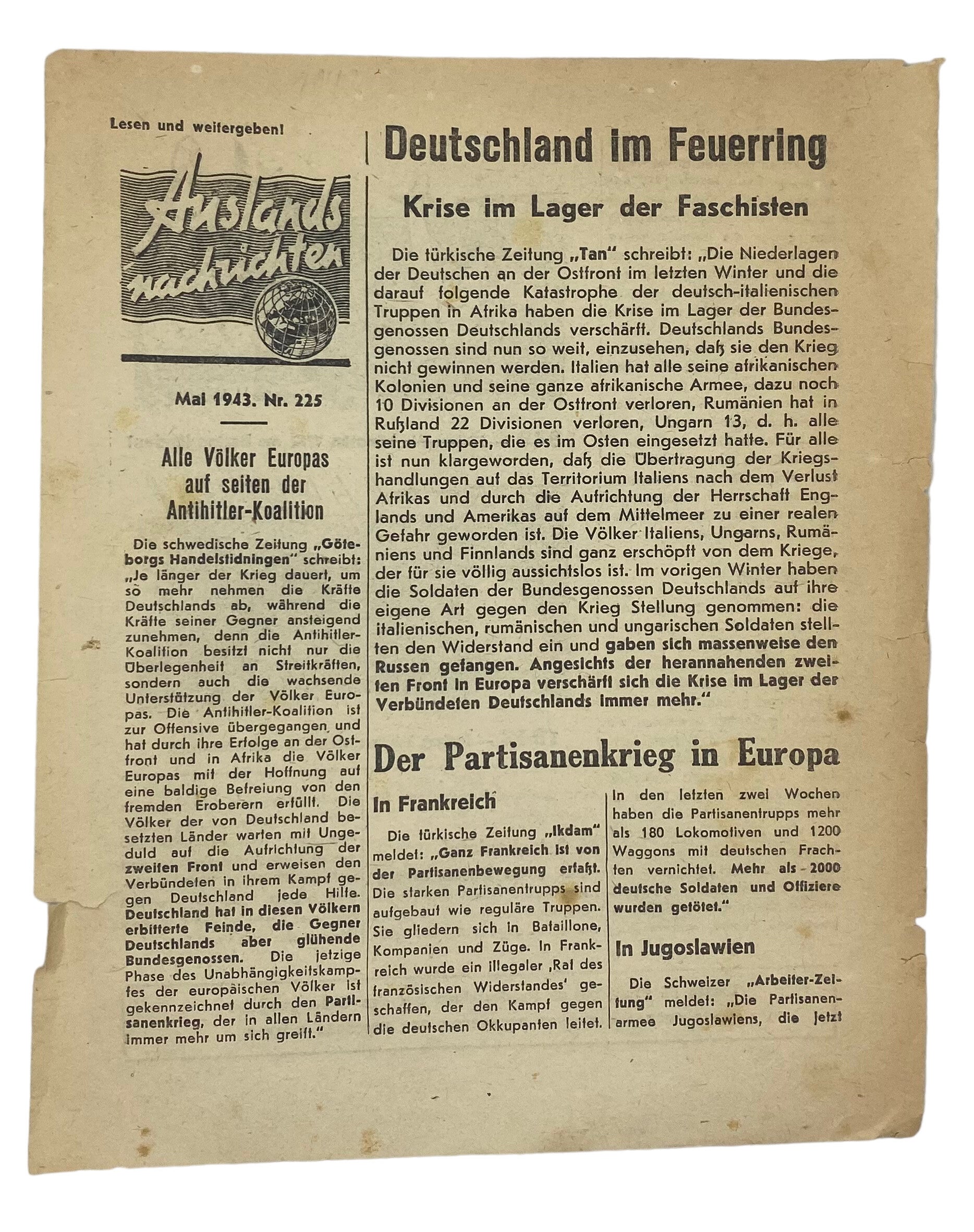 Original WW2 Russian Leaflet - 2528 "Auslandsnachrichten Nr. 225, Mai" (1943)