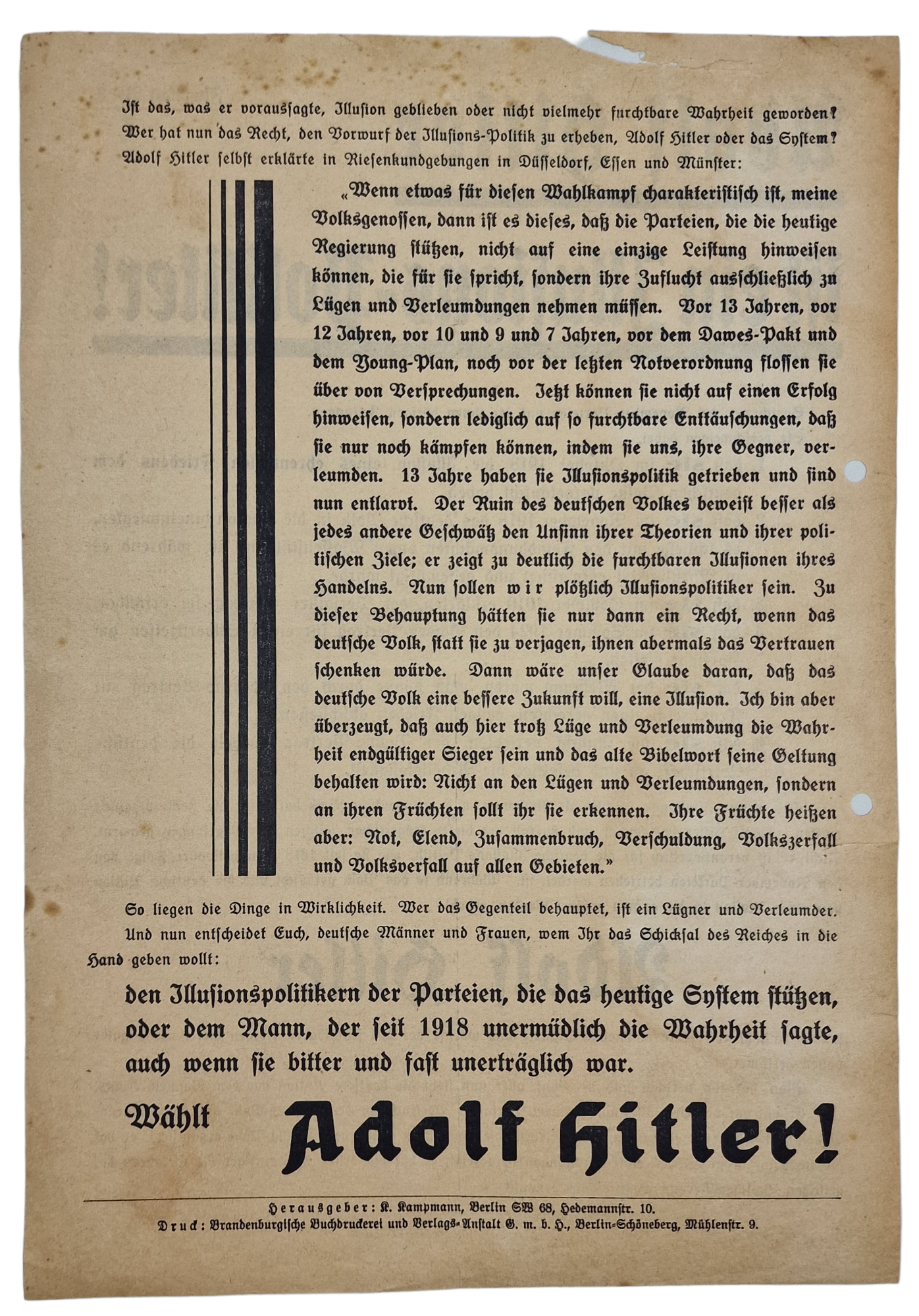 Original WW2 German NSDAP Document - Election Flyer ''Flugblatt Nr. 8 Adolf Hitler ist ein Illusions-Politiker!'' (1932)