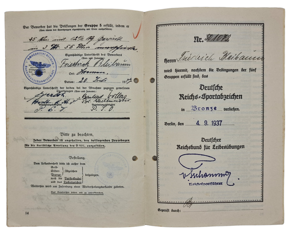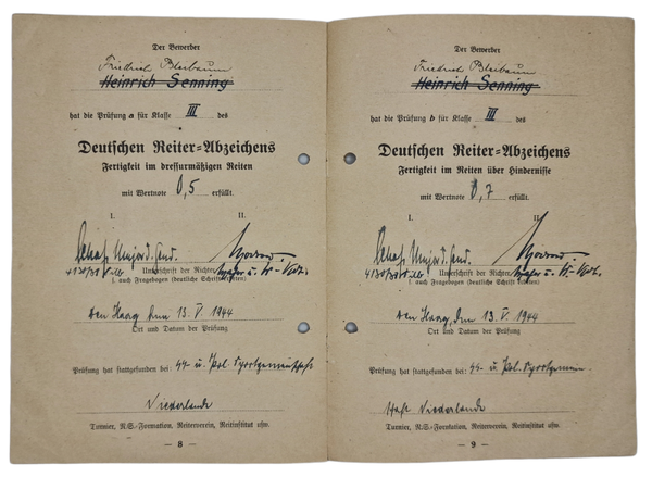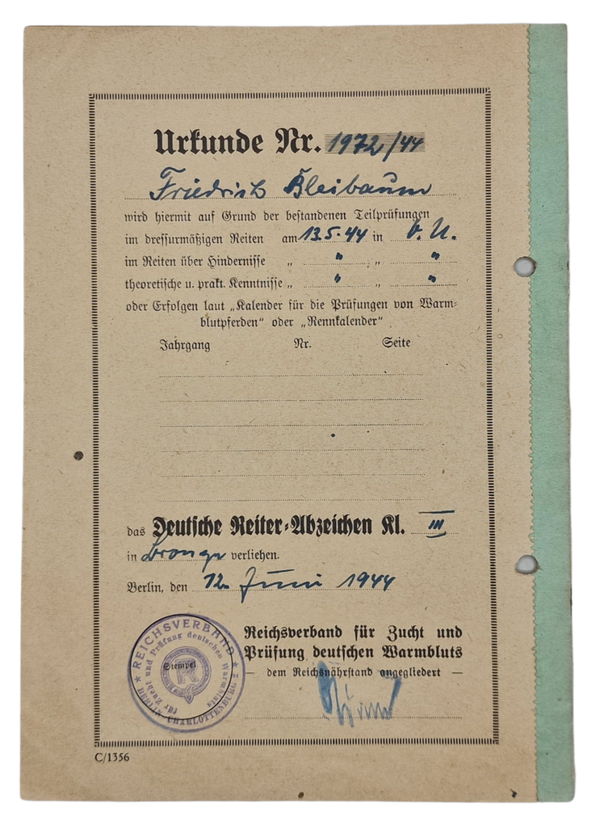Citation set of Friedrich Bleibaum of a Reiter Abzeichen signed by a SS Polizei officer in the Hague. The DRL bronze citation is from 1937.