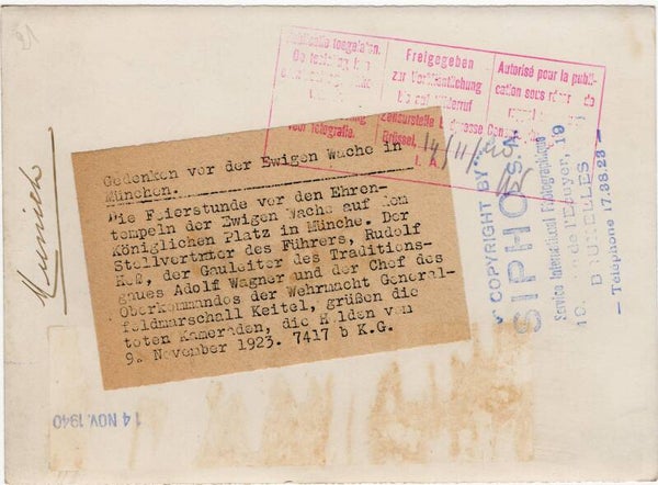 Original WW2 French Press Photo - General Wilhelm Keitel and Rudolf Hess honouring the dead of the Putsch, Munich (1940)