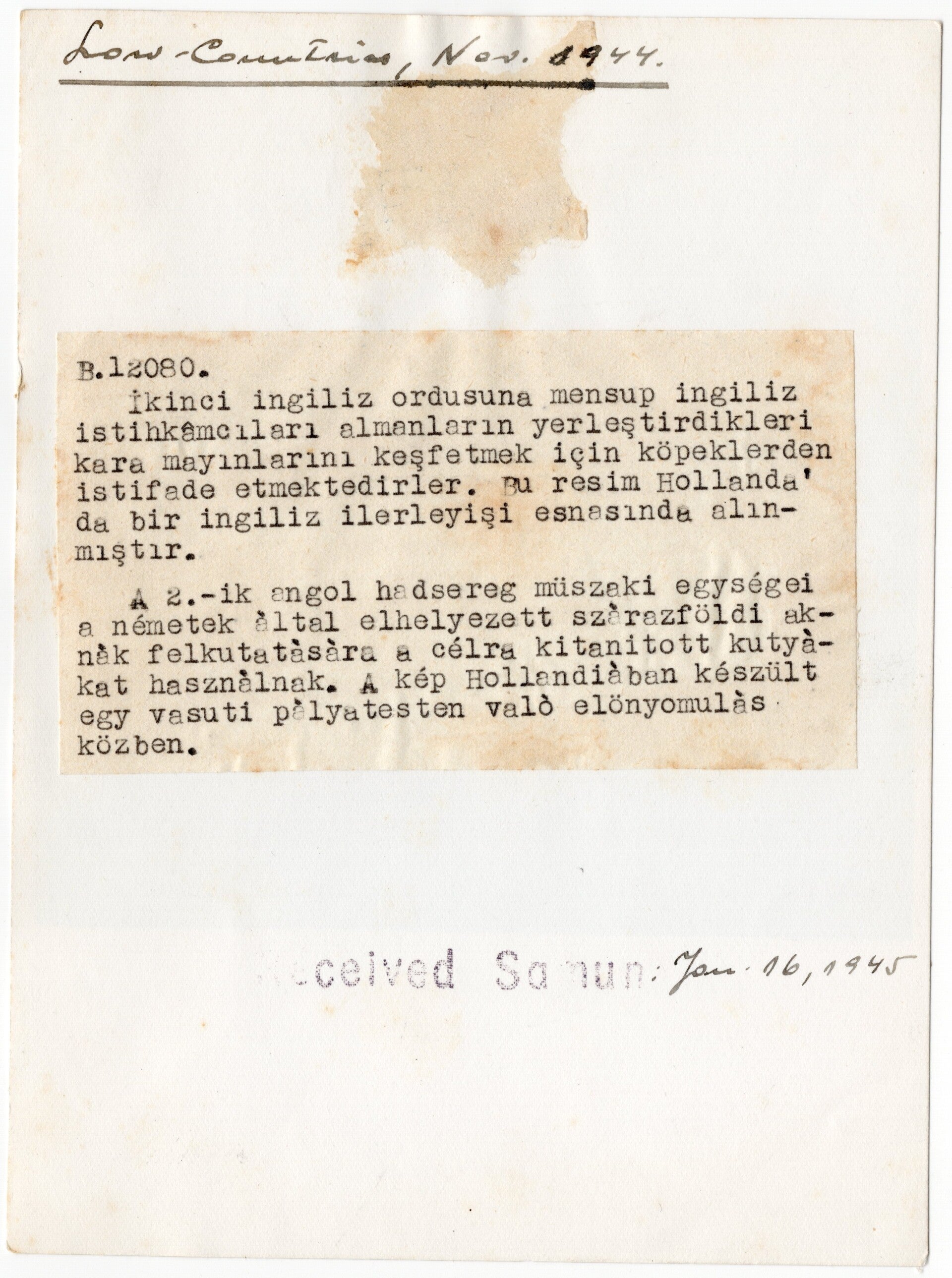 Original WW2 British Press Photo - British 2nd Army Engineers using search dogs for finding landmines, Netherlands, November (1944)