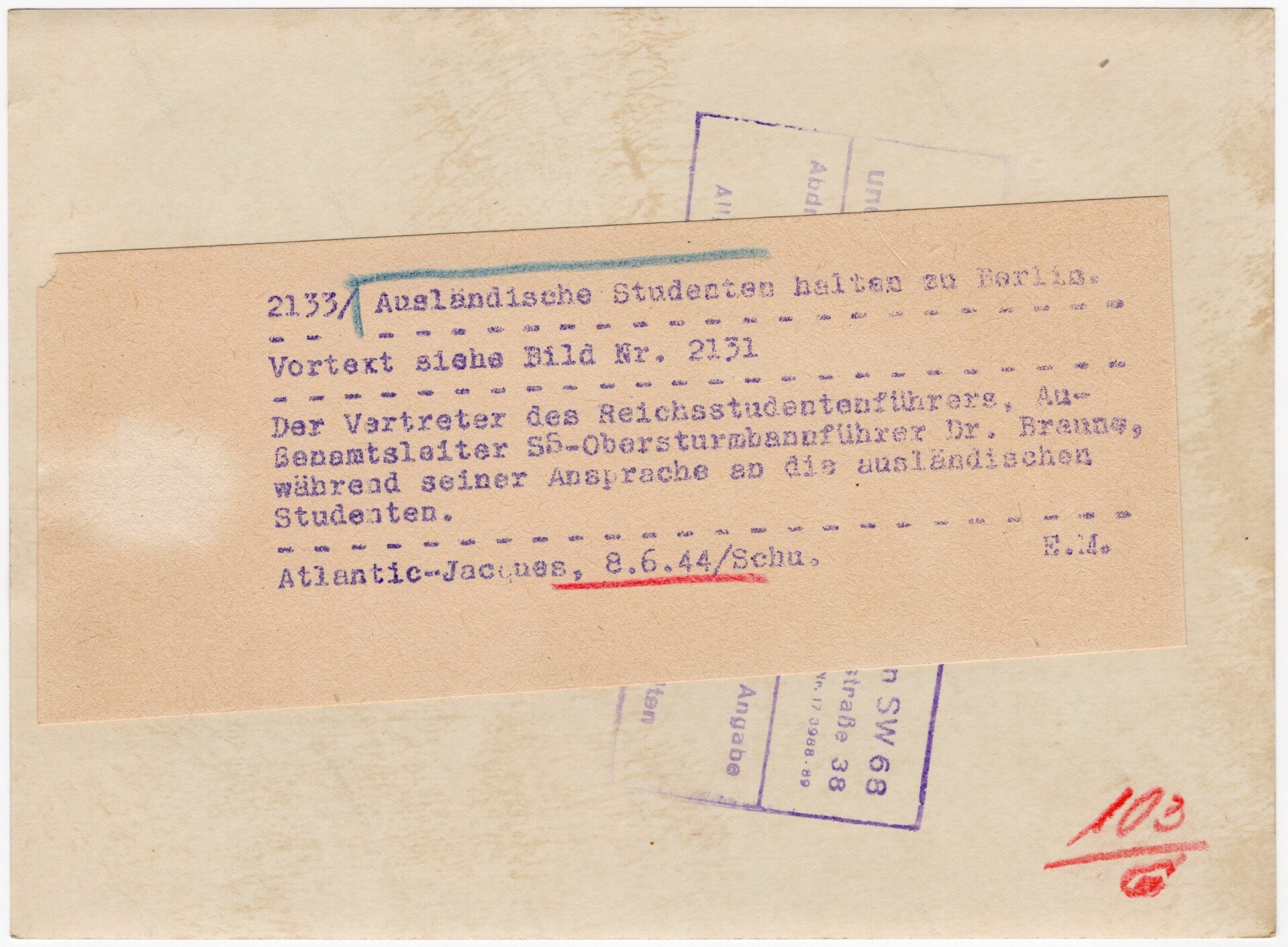 Originele Wo2 Duitse Persfoto - Reichsstudentenführer SS-Obersturmbannführer Dr. Brauns praat met buitenlandse studenten in Berlijn (1944)