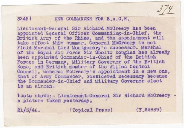 Originele Wo2 Britse Persfoto - General Officer Commanding-in-Chief Sir Richard McCreery (1946)