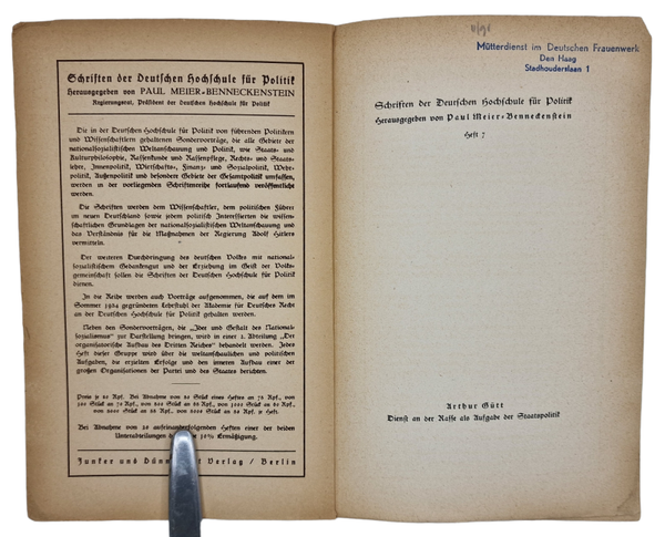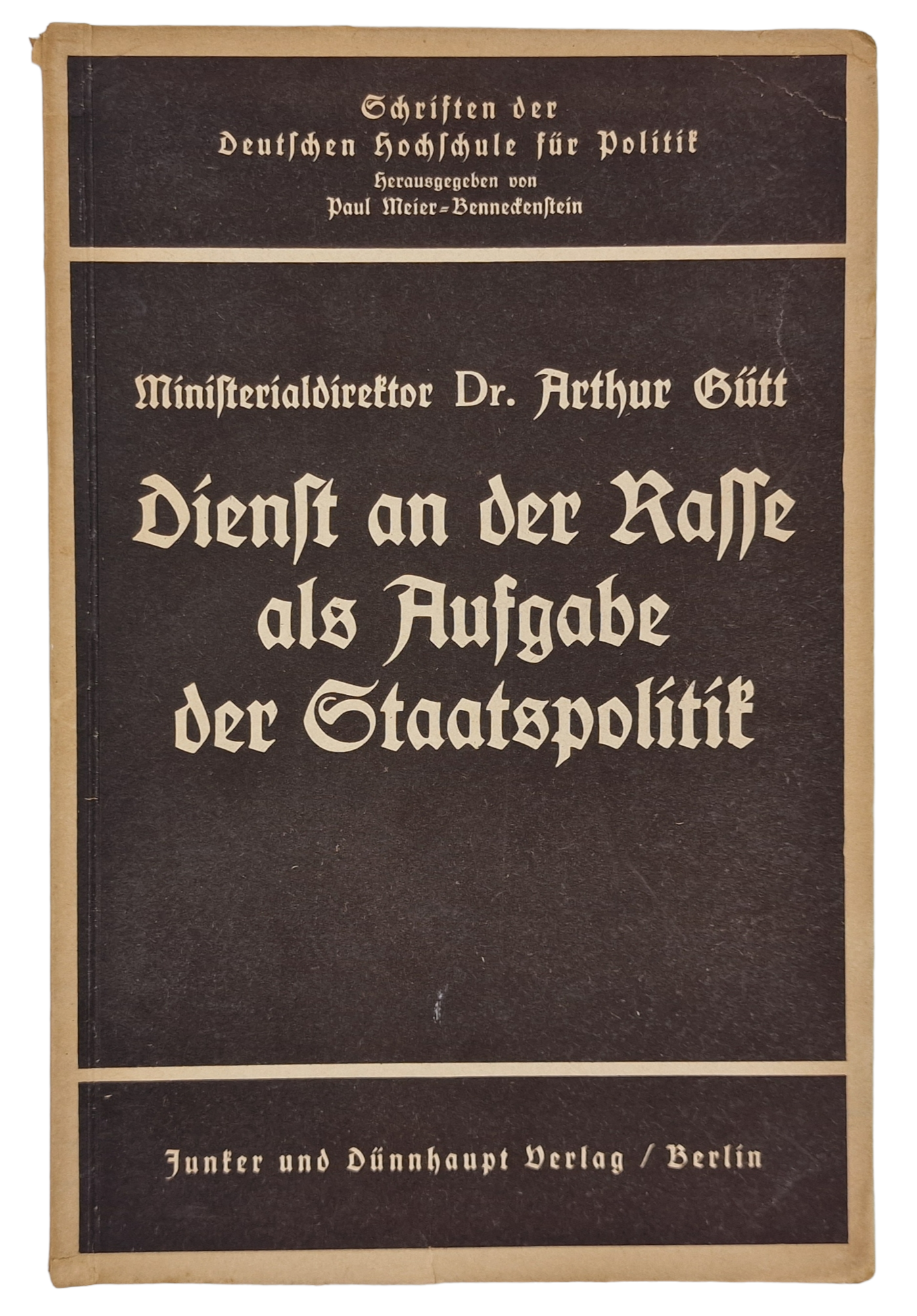 Original WW2 German Brochure - Dienst an der Rasse als Aufgabe der Staatspolitik, Arthur Gütt (1938)