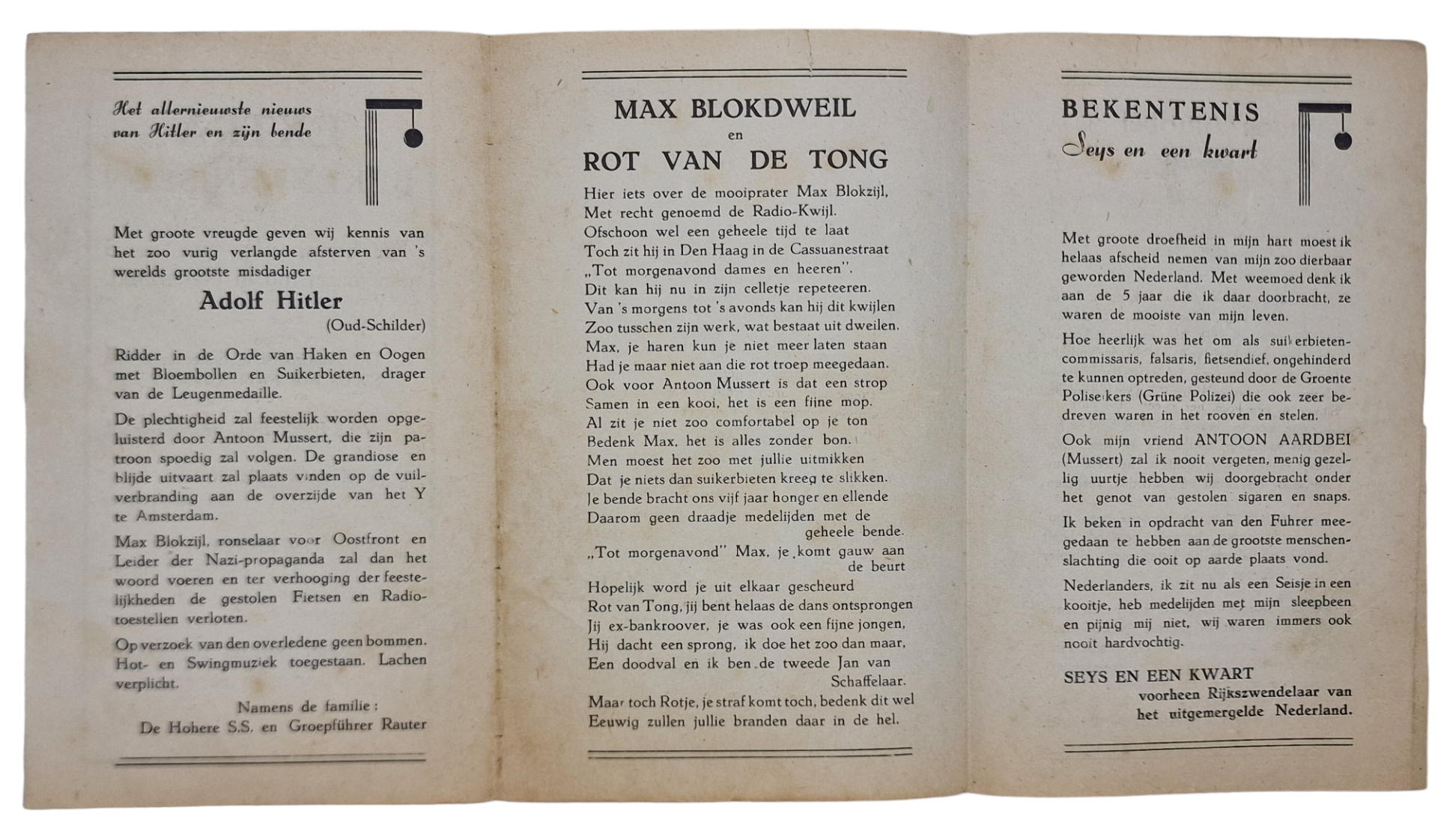 Satirical flyer about Mussert, Rost van Tonningen, Seyss-Inquart and Max Blokzijl.