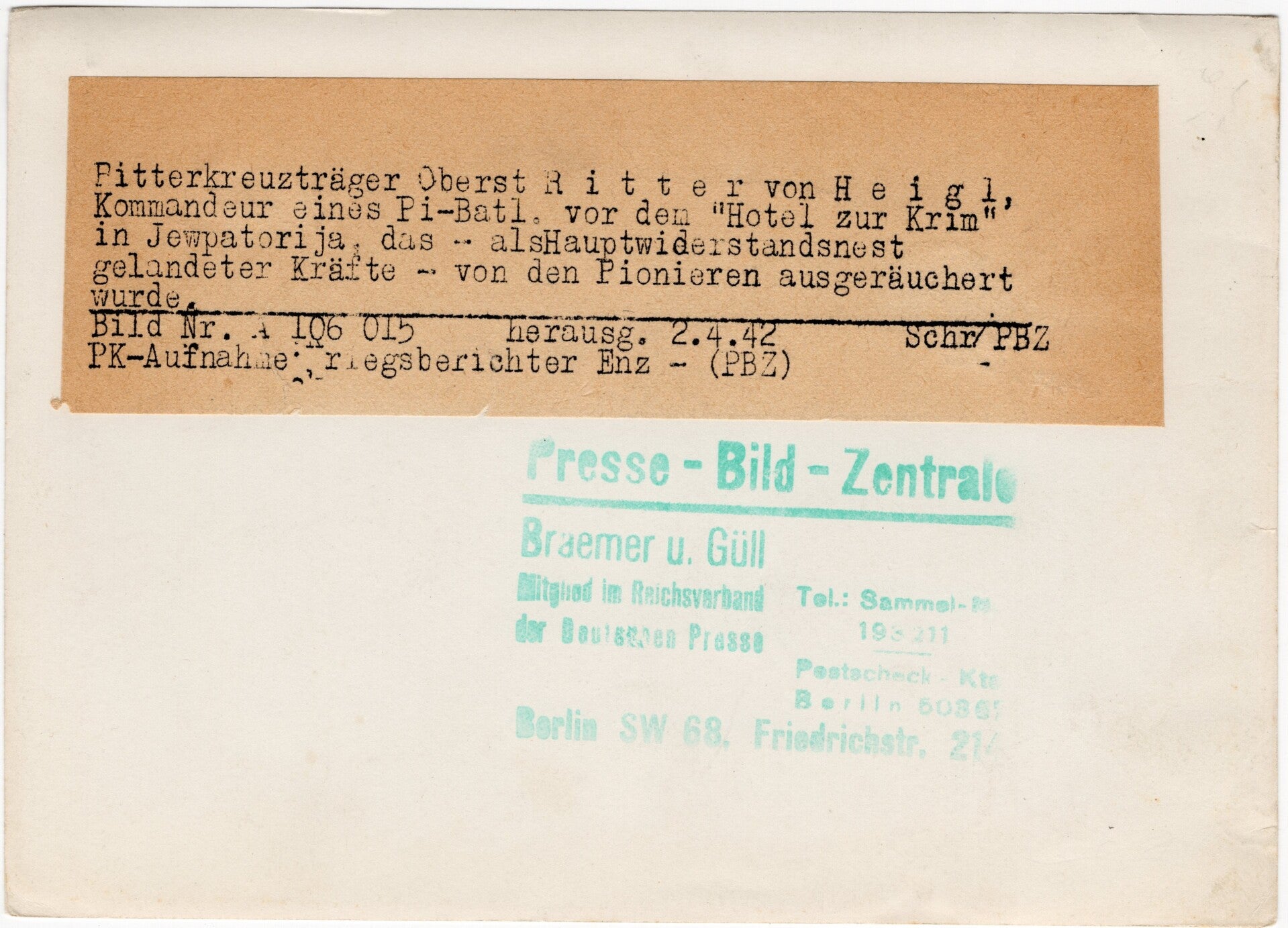 Originele Wo2 Duitse Persfoto - Ritterkreuzträger Oberst Hubertus-Maria Ritter von Heigl op de Krim, Oekraïne (1942)