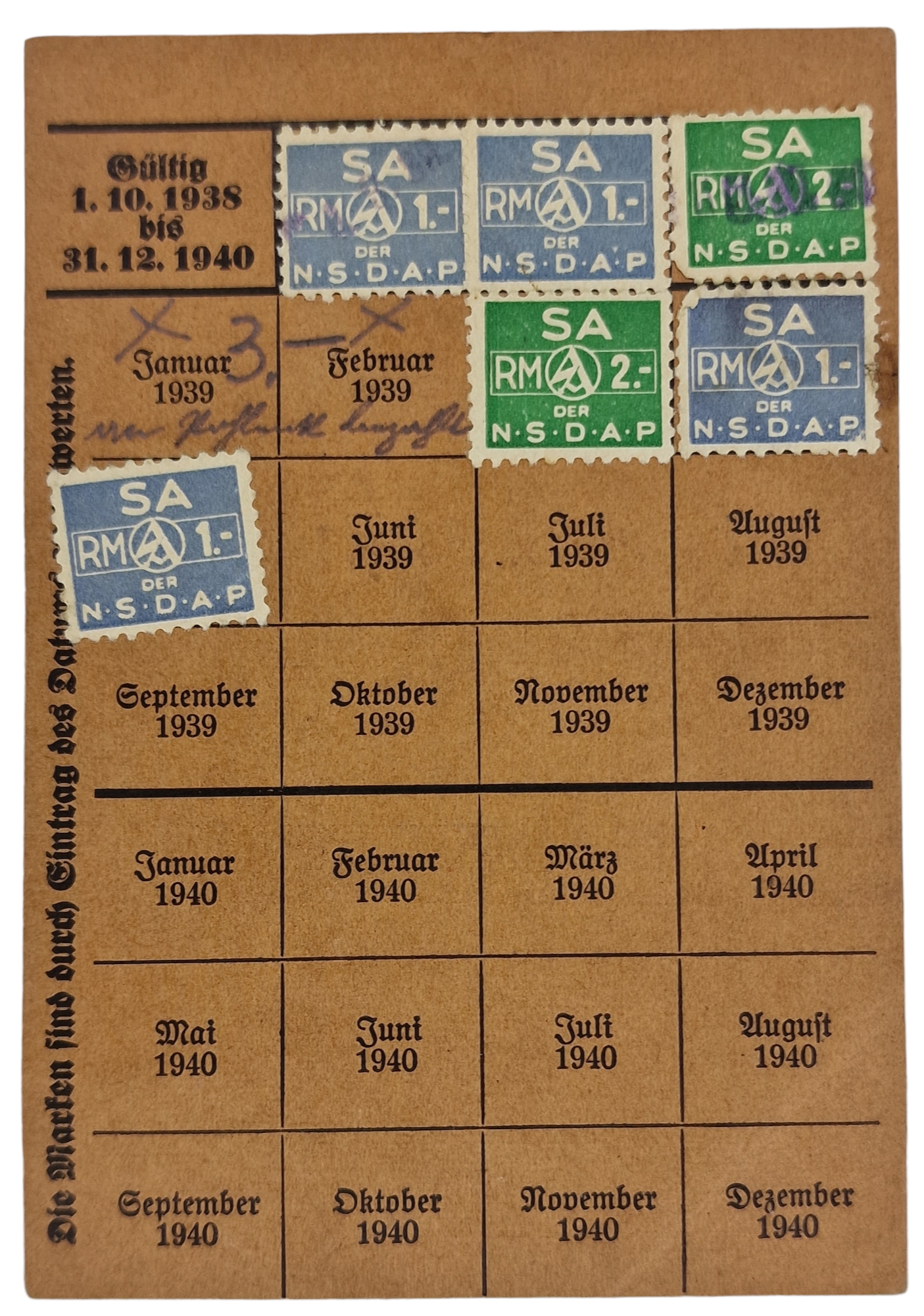 Original WW2 German SA Document - SA Quittungskarte Neusalza-Spremberg (1939)