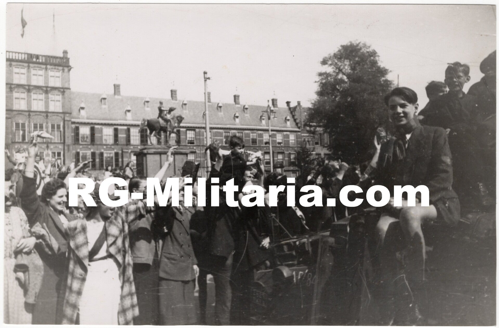 Originele Wo2 Nederlandse Bevrijdings Persfoto - Geallieerde voertuigen komen aan bij het Binnenhof, Den Haag (1945)
