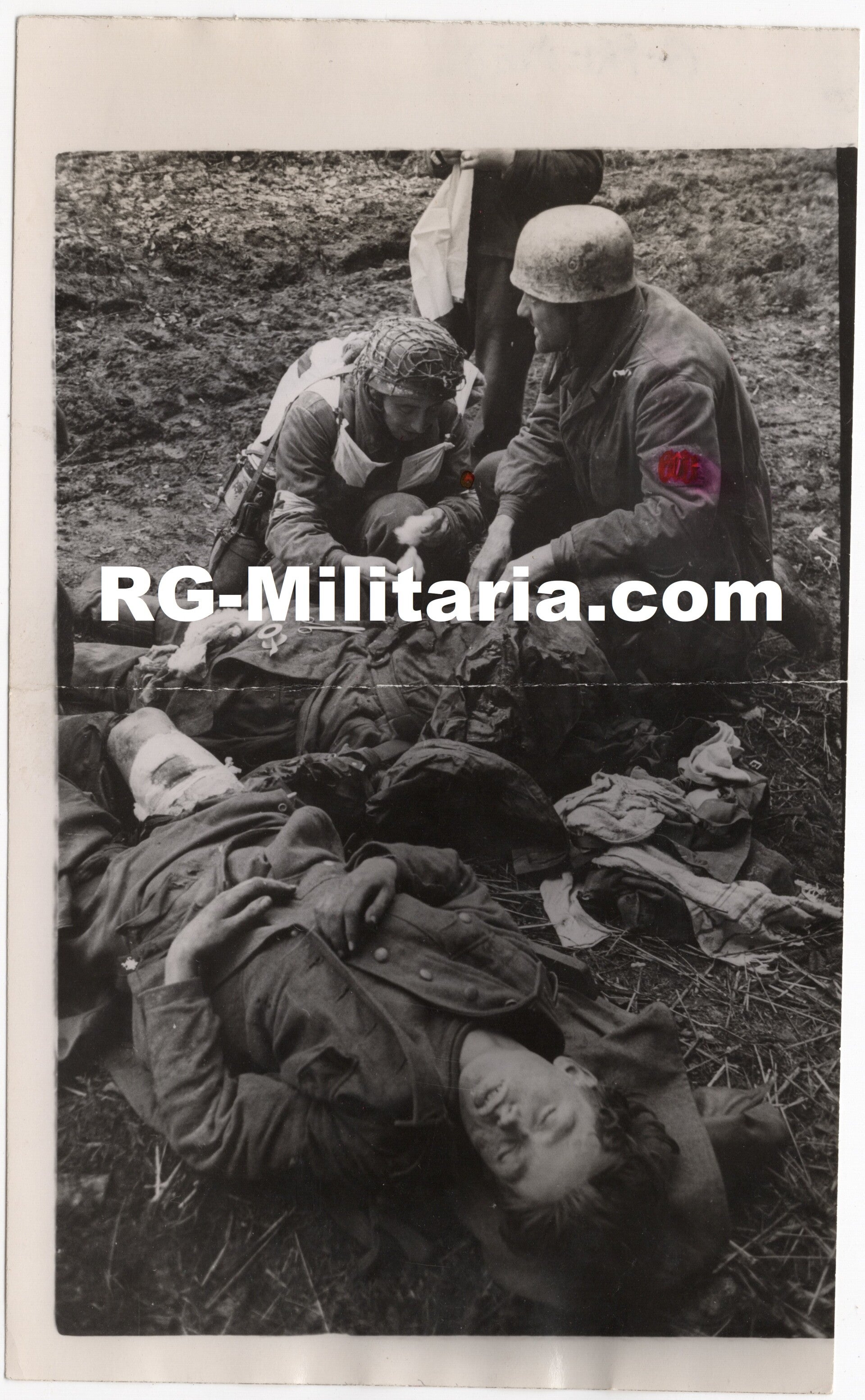 Originele Wo2 Britse Persfoto - Operatie Veritable, Duitse Fallschirmjäger medisch personeel helpt gewonde Duitse militairen (1945)