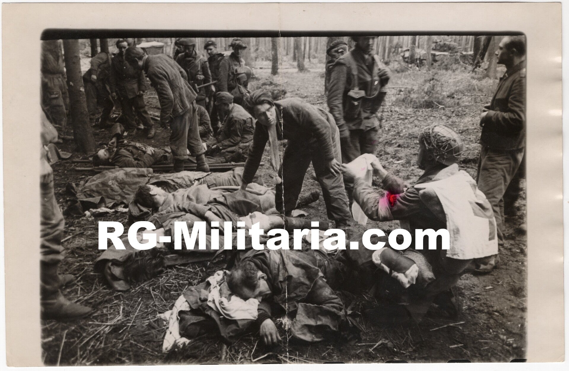 Originele Wo2 Britse Persfoto - Operatie Veritable, Duitse Fallschirmjäger medisch personeel helpt gewonde Duitse militairen (1945)