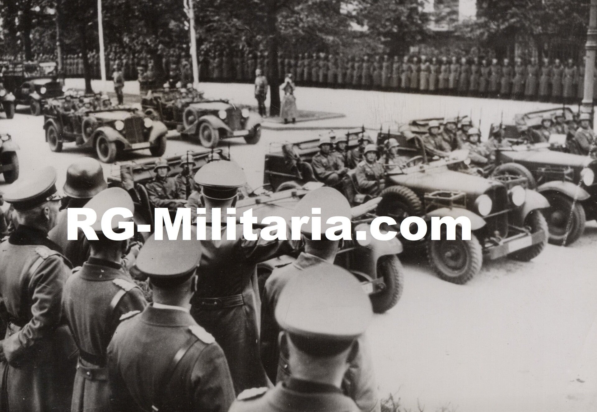 Originele Wo2 Britse Persfoto - Adolf Hitler saluteert de Duitse militairen bij de Bevrijdings optocht in Warschau in Oktober (1939)