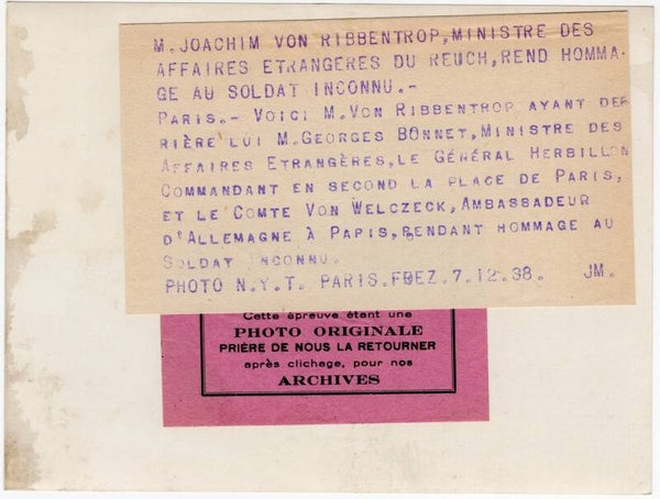 Originele Wo2 Franse Persfoto - Minsiter Joachim von Ribbentrop eert de gevallen miltair, Parijs, Frankrijk (1938)