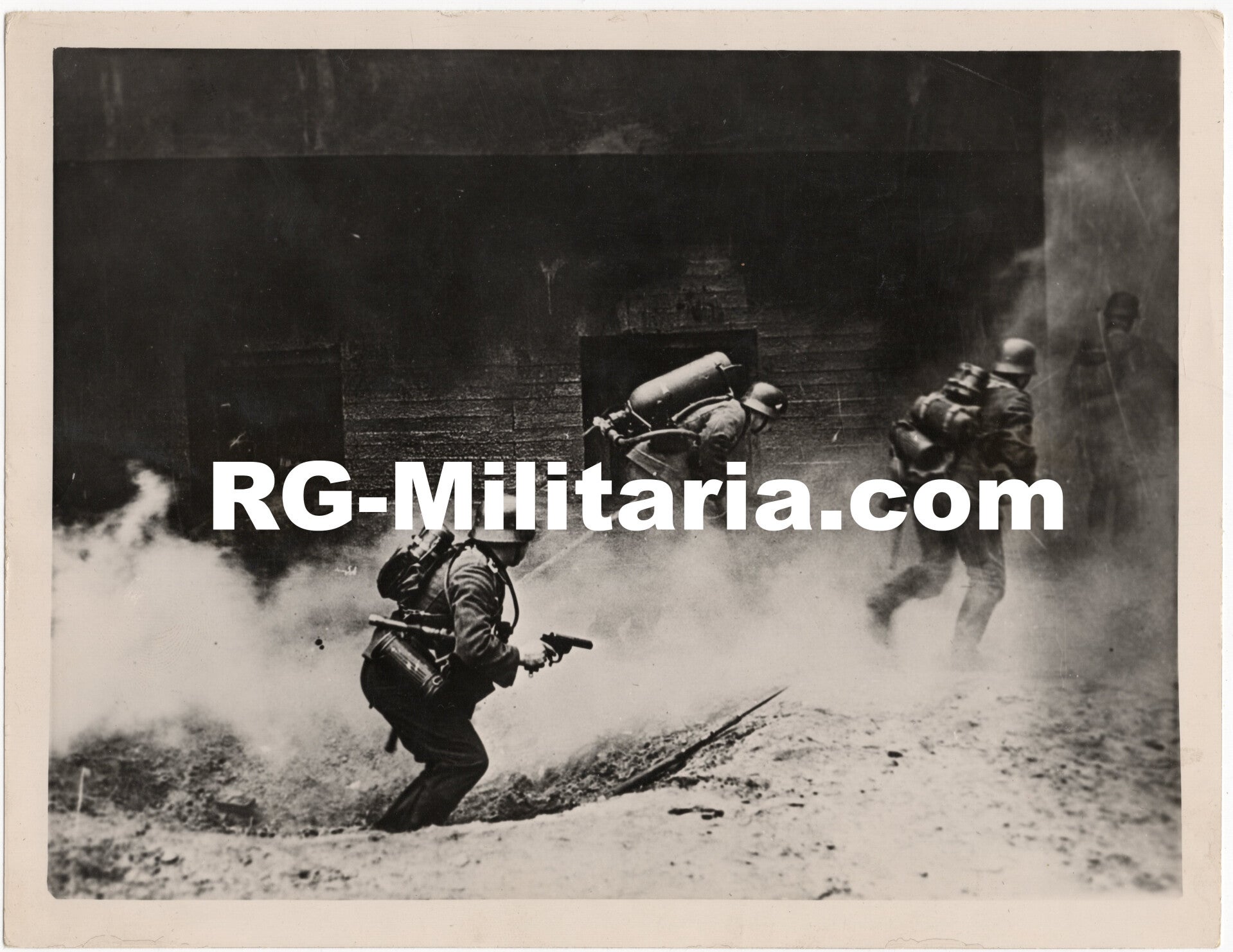 Original WW2 British Military Photo - Wehrmacht soldier with a Flammenwerfer 35 and another with a Walther LP34, Flare gun