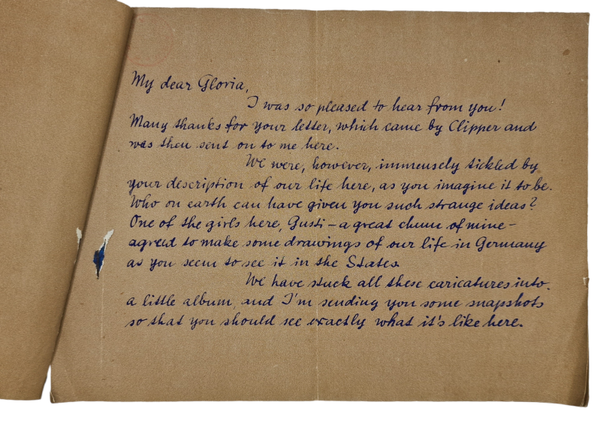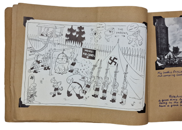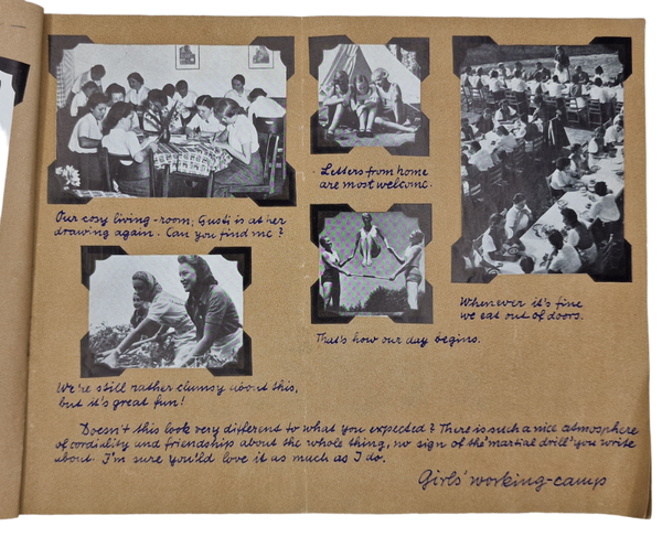 Rare German nazi propaganda brochure written in English. It is supposed to look like a photo album from a German Hitler Jugend girl. On one page there is a cartoon of a nazi caricature and on the other site it shows what it ''really looked like''.