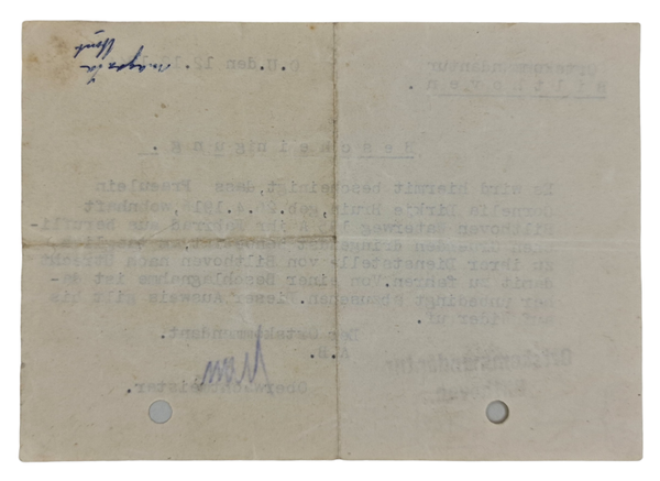 Original WW2 Dutch Document - Bescheinigung bicycle permit Ortskommandantur Bilthoven, Utrecht (1944)