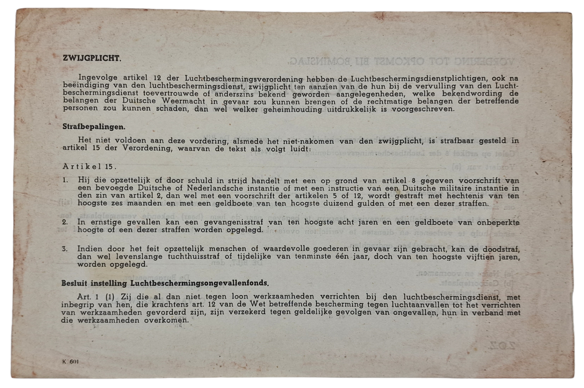 Origineel Wo2 Nederlands LBD Document - Luchtbeschermingsdienst vordering tot opkomst bij bominslag, de Bilt (1942)