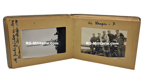 Interesting photo album from the Flak Batterie Sprüch (?) in Den Dolder, with a total of 47 photos, of whom most made in the Netherlands. The Batterie guarded the air around Fliegerhorst Soesterberg. The binding of the album is damaged, and some pages are loose. The photos are about 6 x 9 cm.