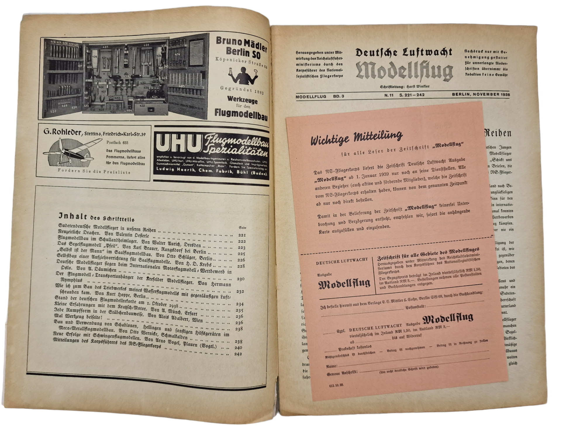 Original WW2 German NSFK Magazine - Deutsche Luftwacht ausgabe Modellflug 3rd year No. 11, November (1938)