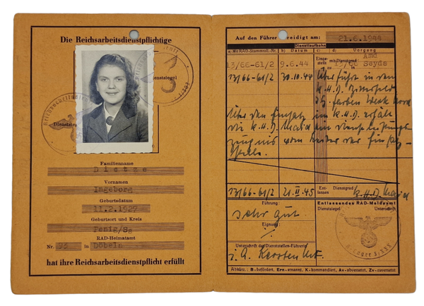 Interesting document set of a Reichsbahn gehilferin from Germany that worked in Poltava, Ukraine and later in Venice Italy in 1945! Includes a rare Ersatz Soldbuch (Einsatzbuch) filled in on the 23th of April 1945 in Italy.