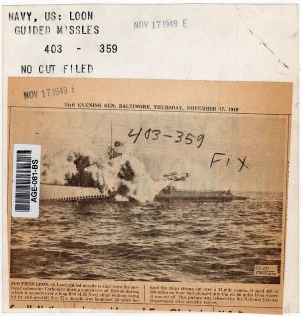 Originele Wo2 Amerikaanse Persfoto - Amerikaans ontwikkelde V1 V-wapen afgeschoten door de onderzeer Carbonero, Hawaii (1949)