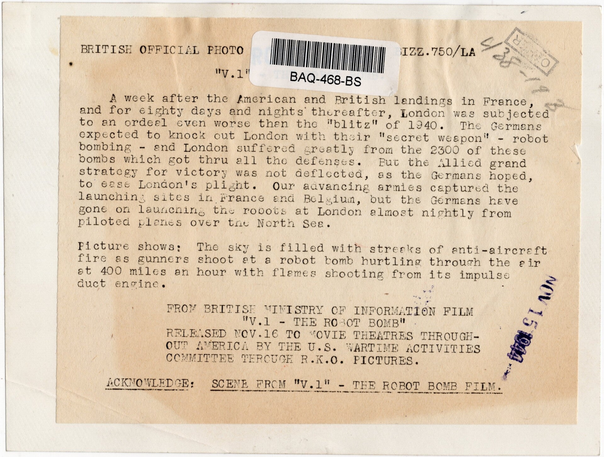 Originele Wo2 Amerikaanse Persfoto - V1 V-Wapen vliegt over Engeland (1944)