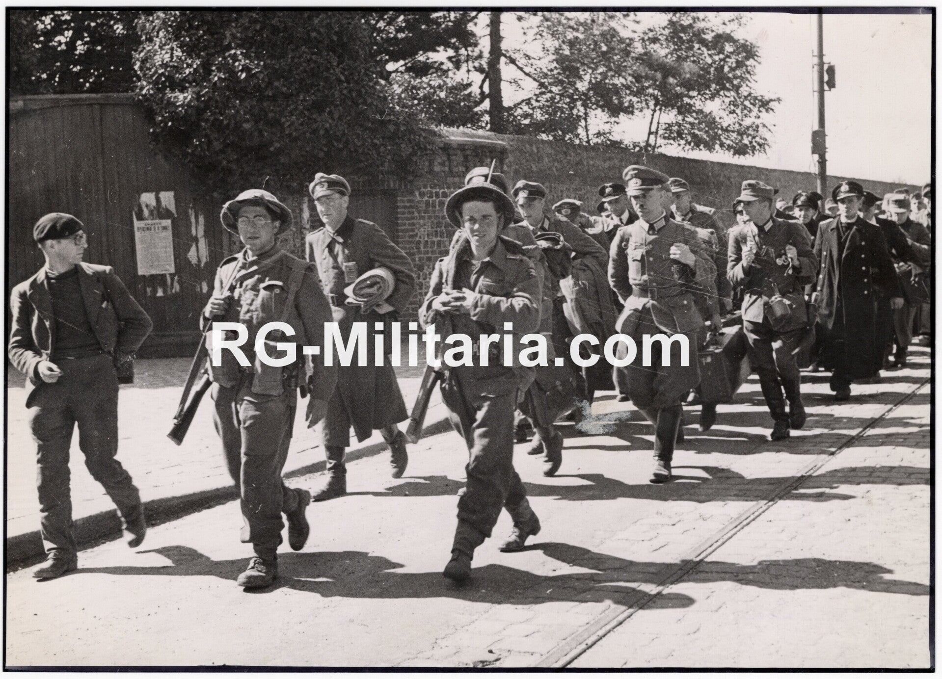 Original WW2 British Press Photo - 49th West Riding Division ''Polar Bears'' with captured German POW soldiers in Le Havre, Operation Astonia (1944)