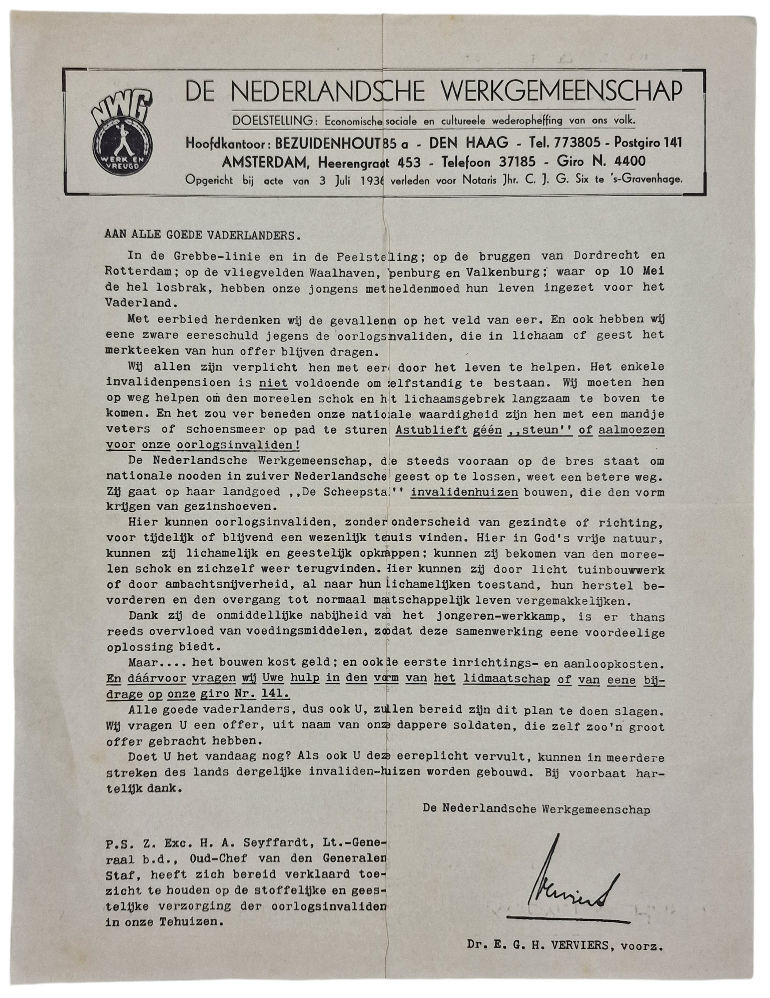 Original WW2 Dutch Collaboration Document - NWG Werk en Vreugd, Dutch war-wounded, Emile Verviers (1941)