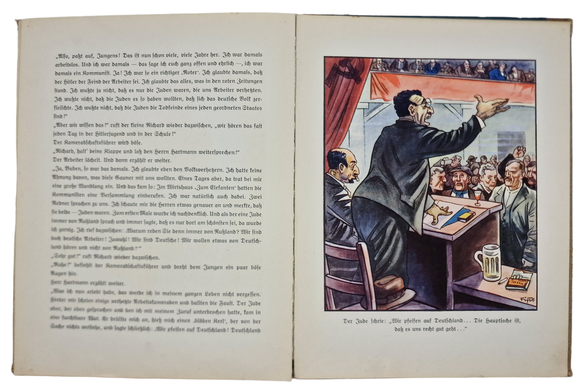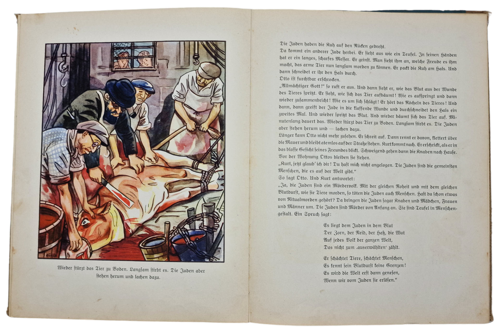 Antisemitische kinderboeken zijn gebruikt door de nazis als een propagandamiddel om de jeugd te laten denken dat de Joden de vijand zijn. Deze boeken zijn gepubliceerd door de antisemitische uitgeverij Der Stürmer van Julius Streicher. In totaal zijn er 60.000 exemplaren gedrukt. Het boek heeft wat schade in de band en rug, zoals gebruikelijk bij deze halflinnen uitgaven.