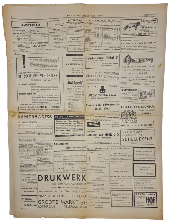 Original WW2 Dutch Collaboration NSB Newspaper - Volk en Vaderland, 9th year No. 33, ''De Joodsche Ziekte'', August (1941)