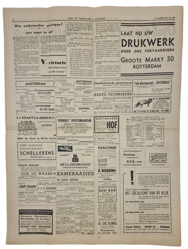 Originele Wo2 Nederlandse Collaboratie NSB Krant - Volk en Vaderland, 9de Jaargang No. 32, Augustus (1941)