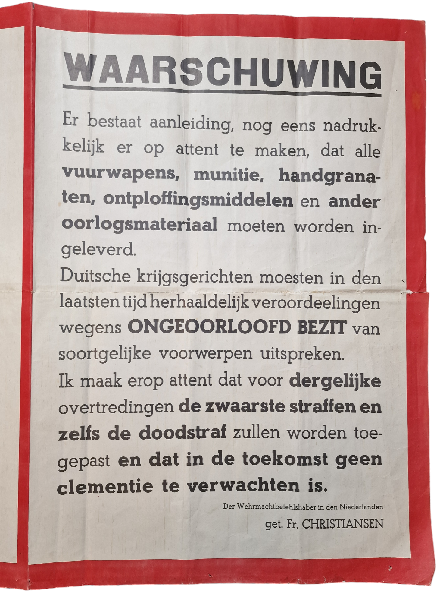 Originele Wo2 Nederlandse Poster - Waarschuwing wapens, munitie, Friedrich Christiansen
