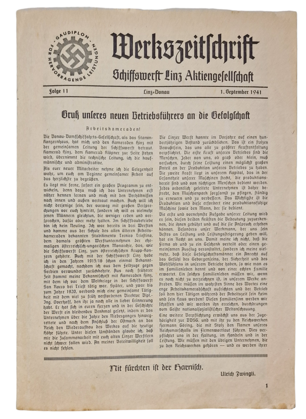 Original WW2 German Magazine - Werkszeitschrift Schiffswerft Linz Aktiengesellschaft (1941)