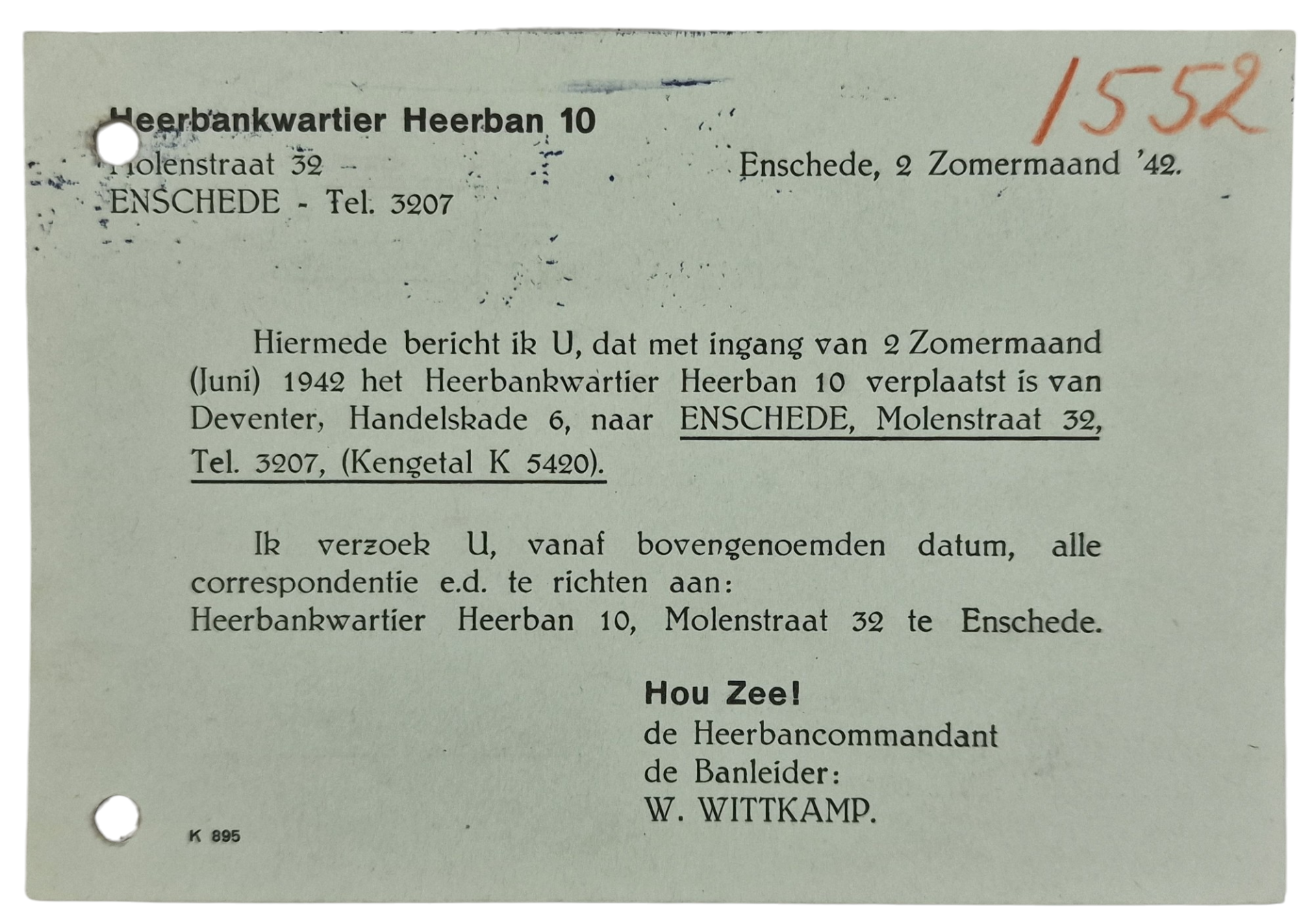Original WW2 Dutch Collaboration NSB Document - Heerbankwartier Heerban 10 headquarters moved from Deventer to Enschede (1942)