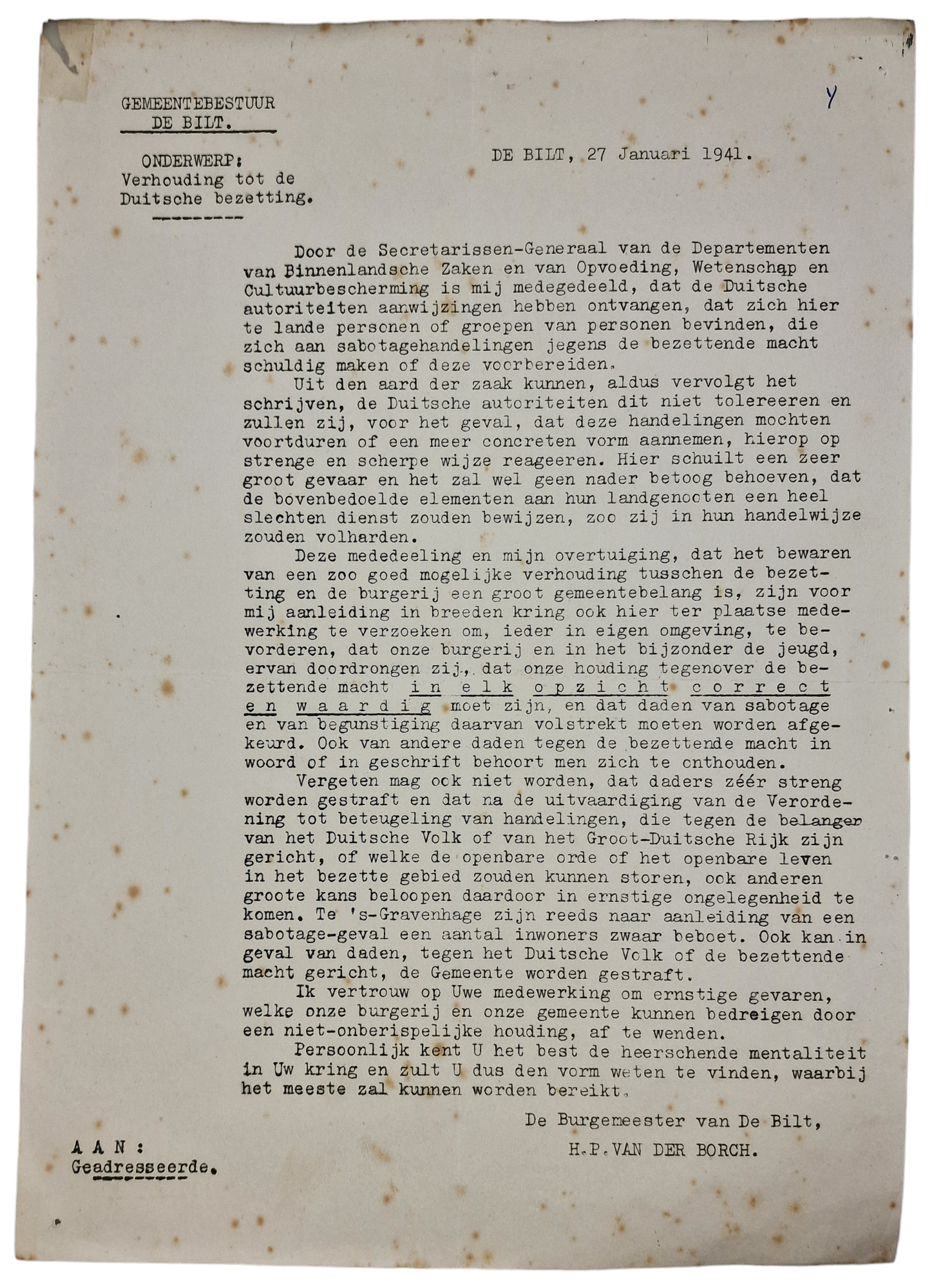 Original WW2 Dutch Document - Attitude towards Germans, De Bilt (1941)