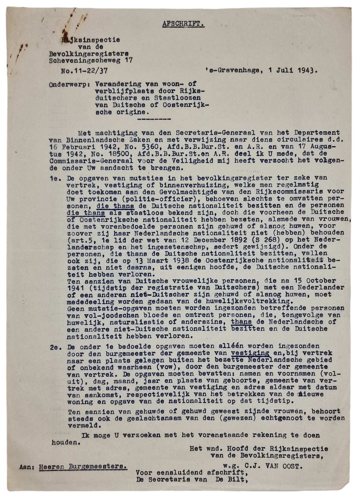 Origineel Wo2 Nederlands Document - Wijziging verblijfplaats Rijksduitsers, de Bilt (1943)