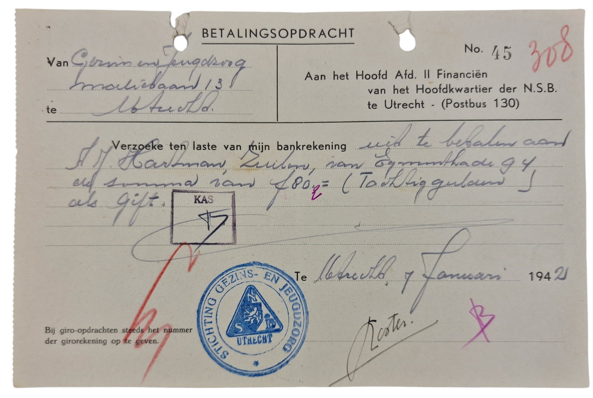 Original WW2 Dutch Collaboration NSB Document - ''Gezins en Jeugdzorg'' payment, Signed W. O. A. Koster, Utrecht, Zuilen (1942)