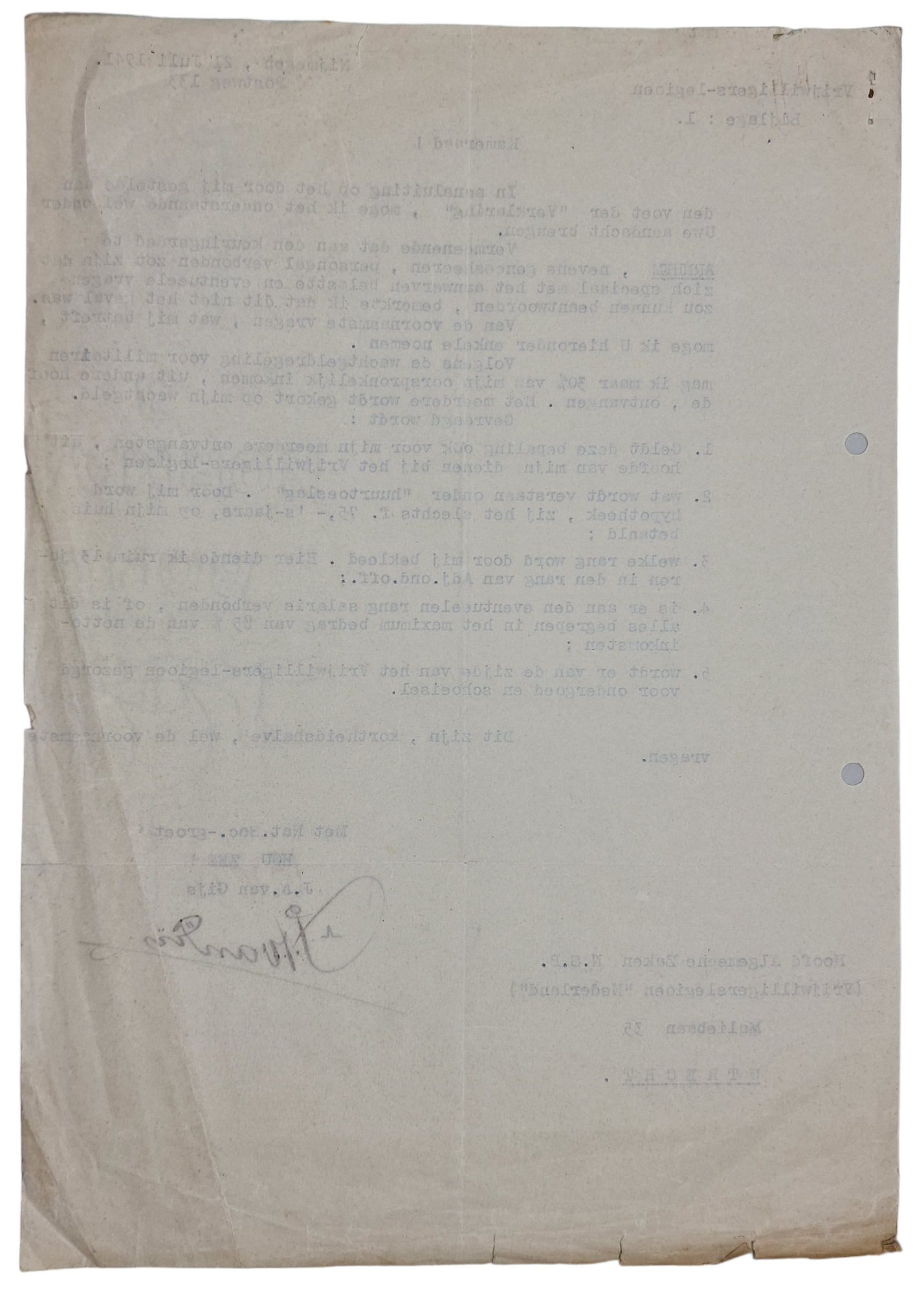 Original WW2 Dutch Waffen SS Document - Vrijwilligers Legioen Nederland letter J. A. van Gijs, Nijmegen, Arnhem (1941)