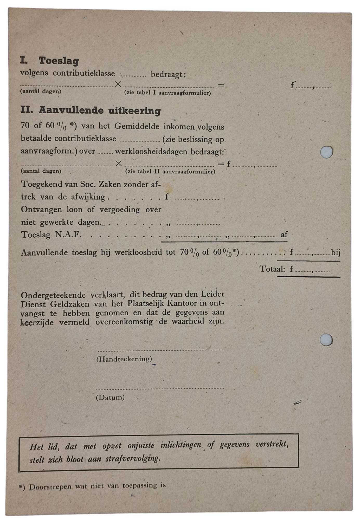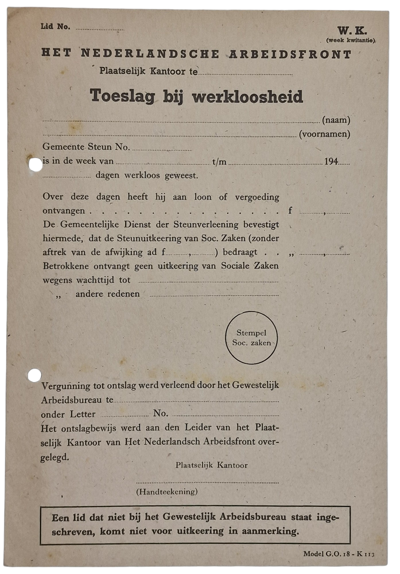 Original WW2 Dutch Collaboration NAF Document - Nederlandsche Arbeidsfront Toeslag bij Werkloosheid form