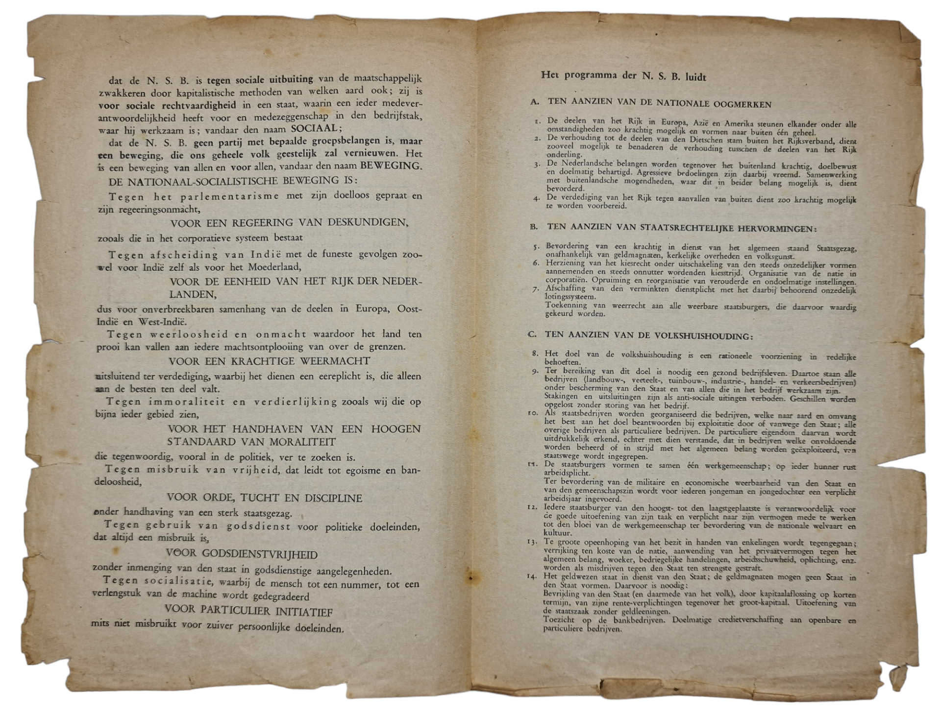 Dutch Collaboration flyer of the NSB, printed in 1934. In the flyer, the program of the NSB is written. The corners are damaged.