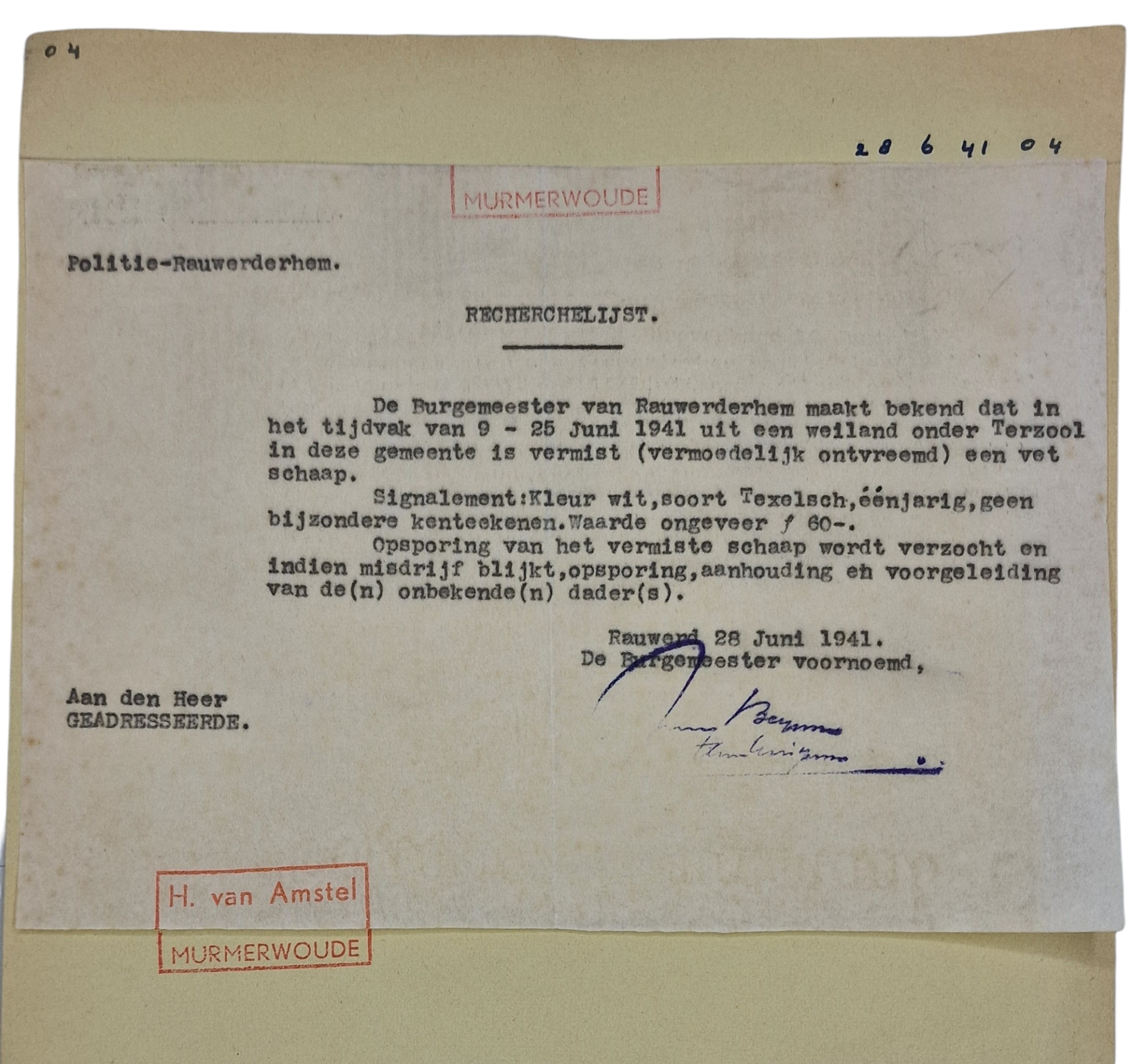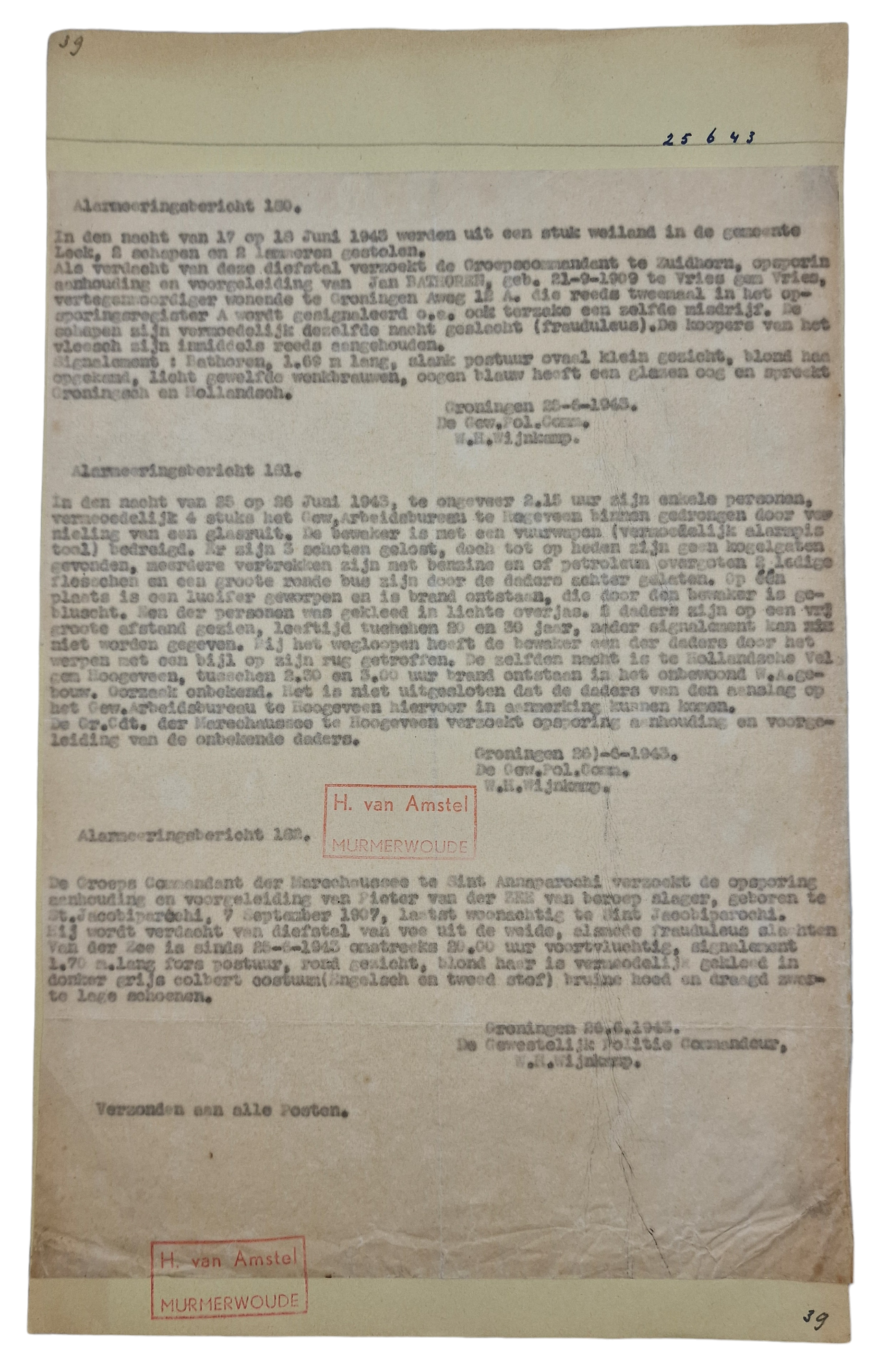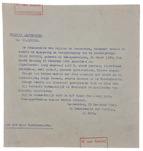 Interessant kavel van 13 politie zoek & alarmeringsberichten uit Friesland en Groningen van 1940 tot 1943. Deze zijn bijelkaar verzameld door H. van Amstel uit Murmerwoude.