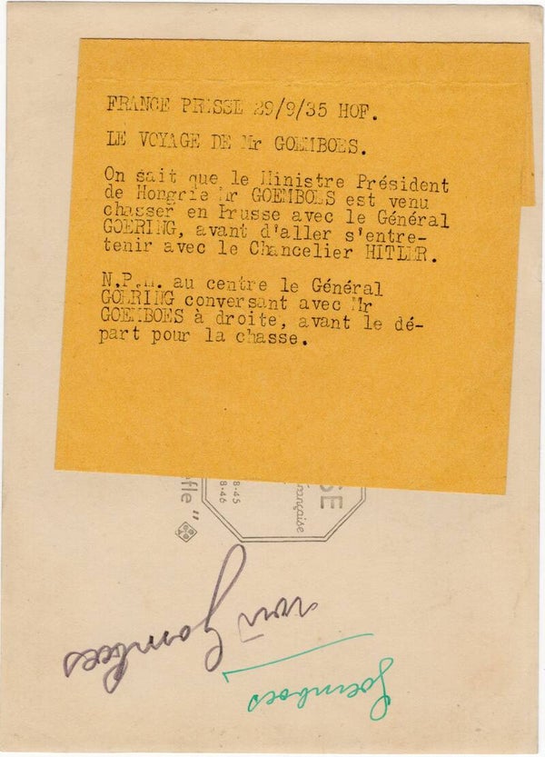 Originele Wo2 Franse Persfoto - Luftwaffe Reichsmarschall Hermann Göring praat met de Hongaarse minister Gyula Goemboes (1935)