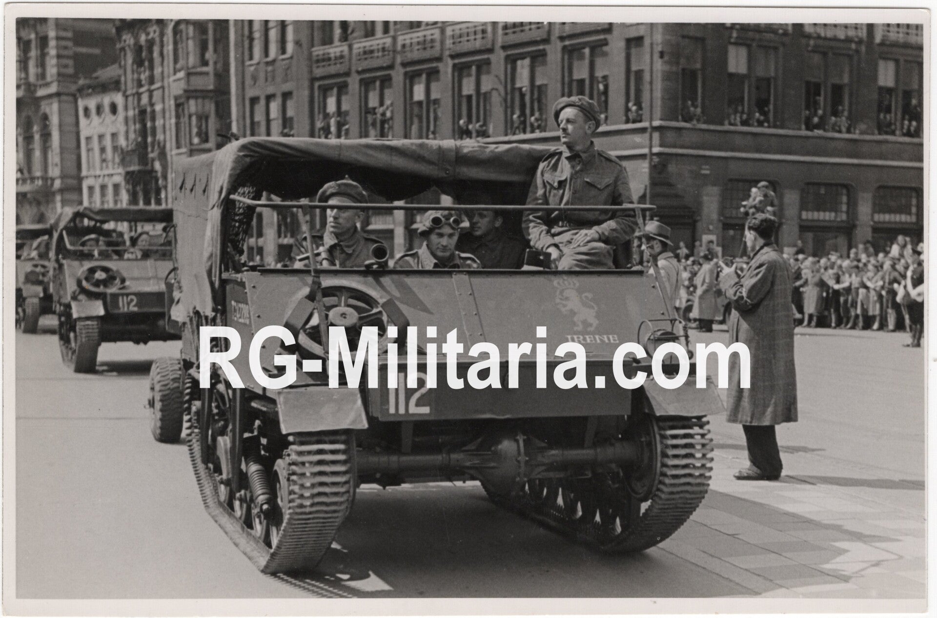 Original WW2 Dutch Liberation Press Photo - PIB Prinses Irene Brigade parade in front of the Dutch Queen Wilhelmina, Dam, Amsterdam (1945)